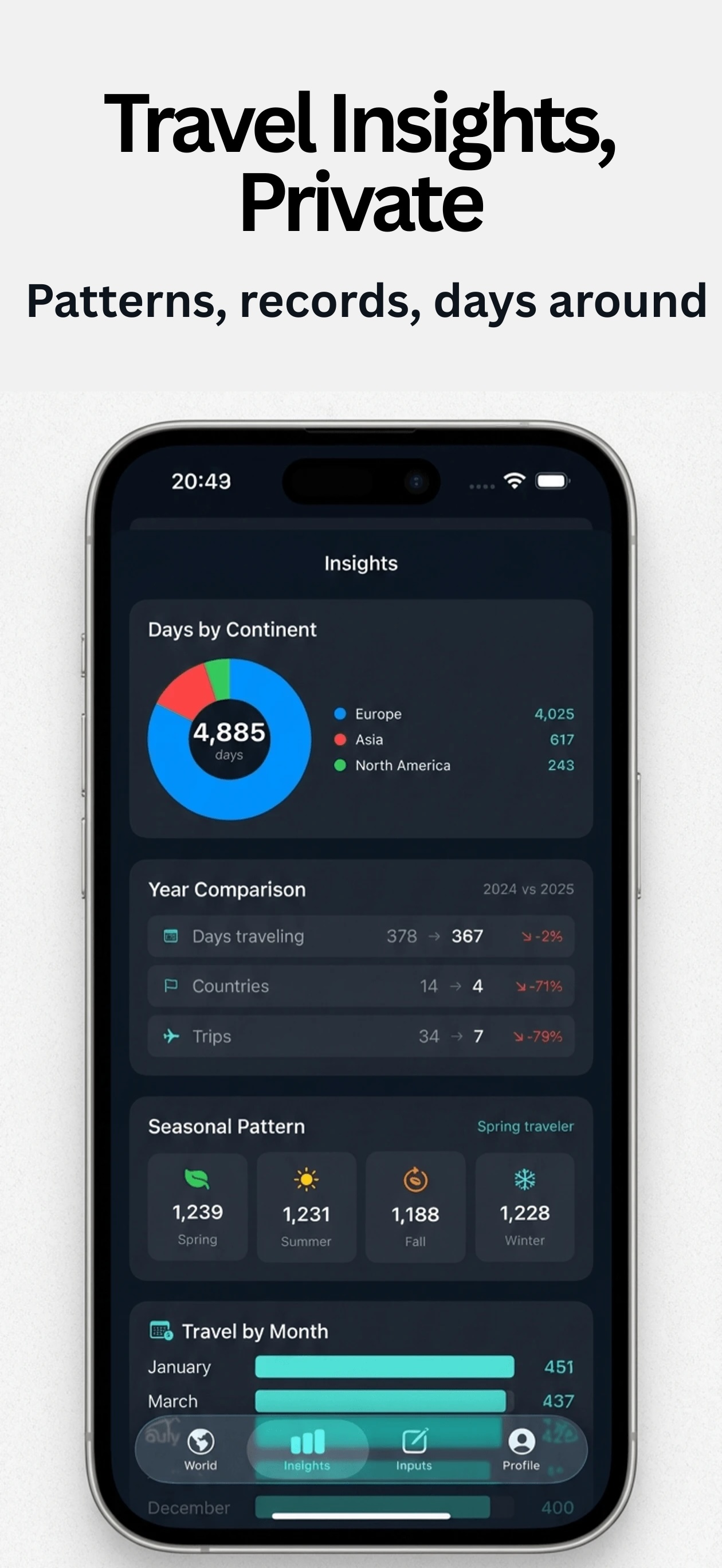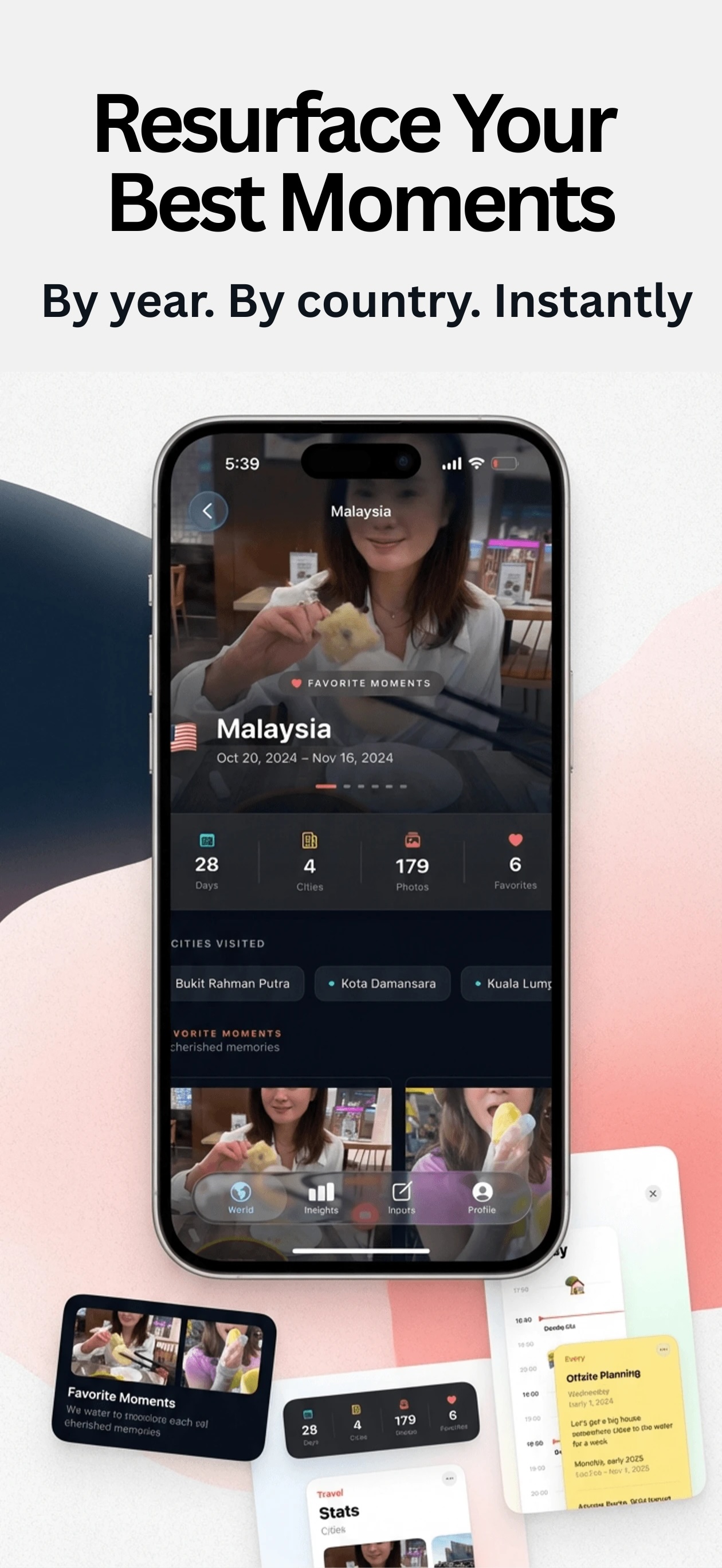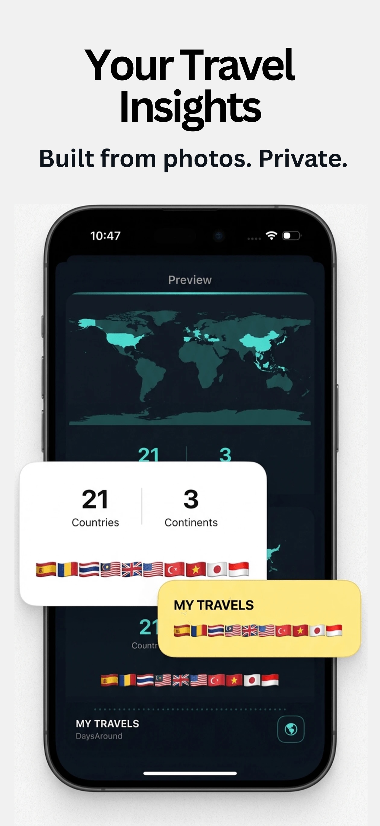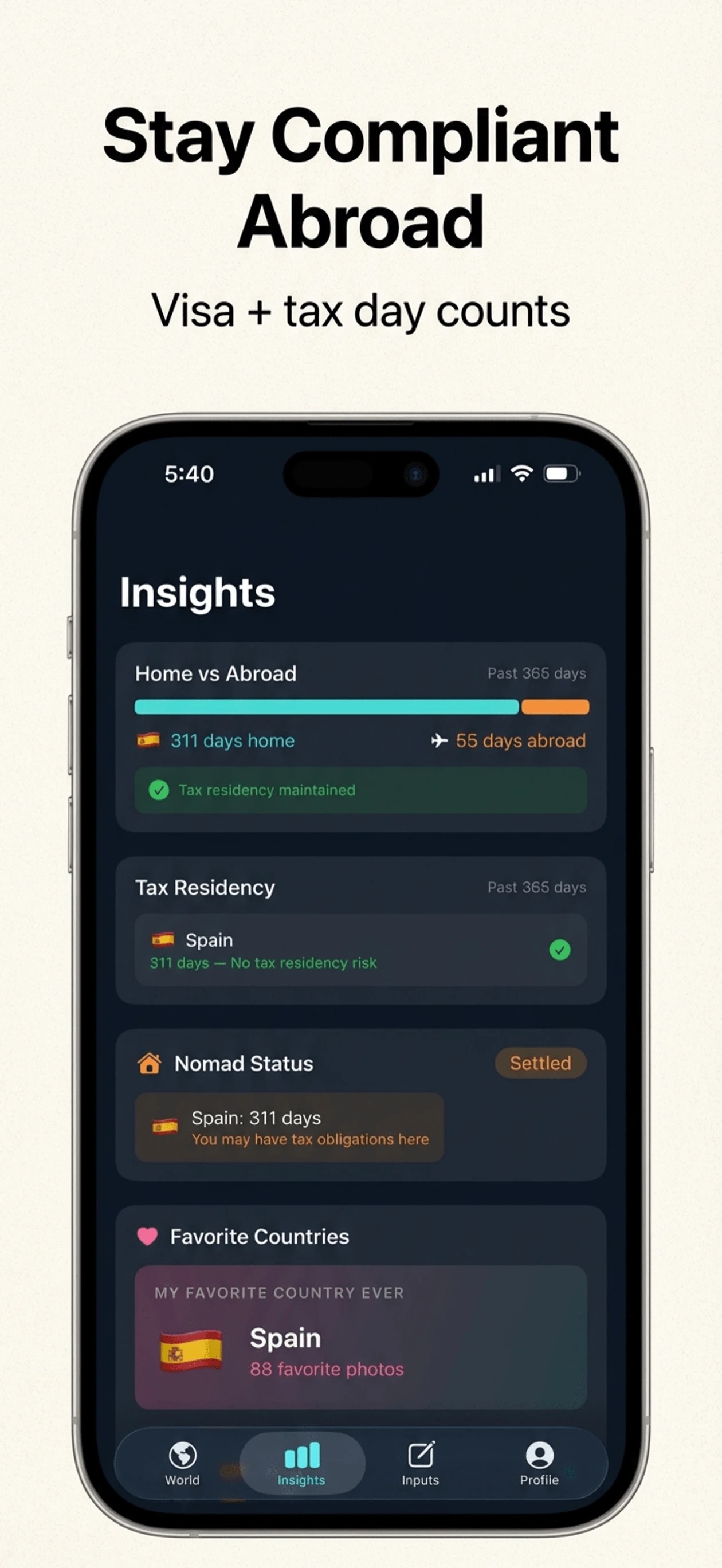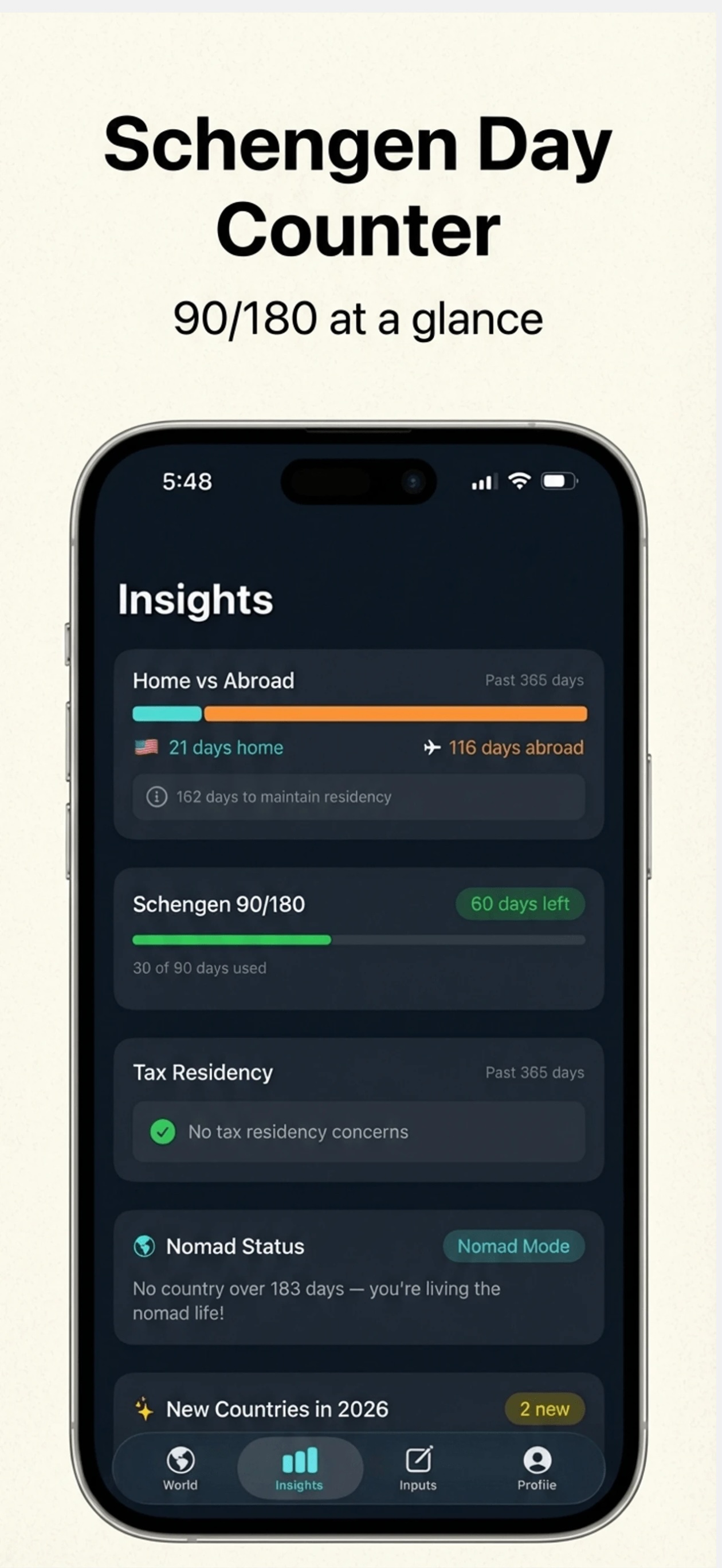 Whether you're tracking the Schengen 90/180-day rule or planning your next visa-free trip, just take photos as you travel — the app builds your timeline on-device, securely and privately.
