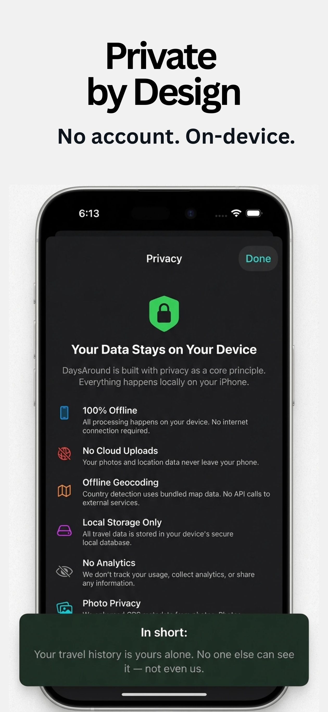 No more manual date entry or spreadsheets. DaysAround is a privacy-first Schengen travel date calculator that automatically detects your stays from your photo library.